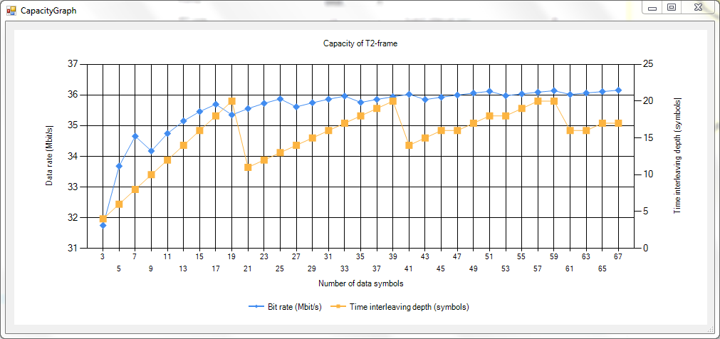 The figure below is a screen shot from PROGIRA® plan where the capacity and interleaving depth graph is presented as a function of the number of used data symbols for the case of FFT size 32K, extended carrier mode, guard-interval fraction 1/128, 256-QAM, code rate 3/5, and the long FECFRAME. In this example it can be seen that the best choice of number of data symbols would be 59. This choice would results in a high bit-rate (about 36 Mbit/s) and a high time interleaving depth (20 symbols).